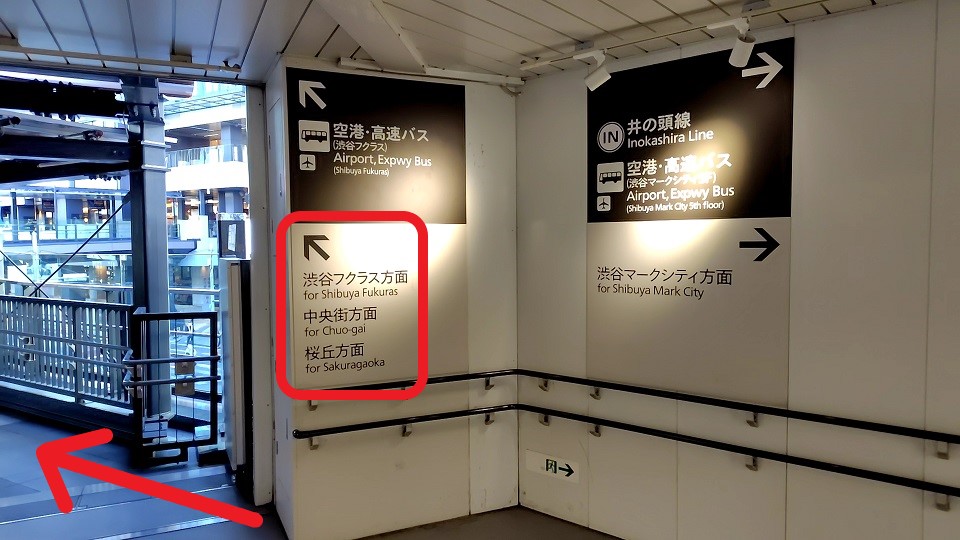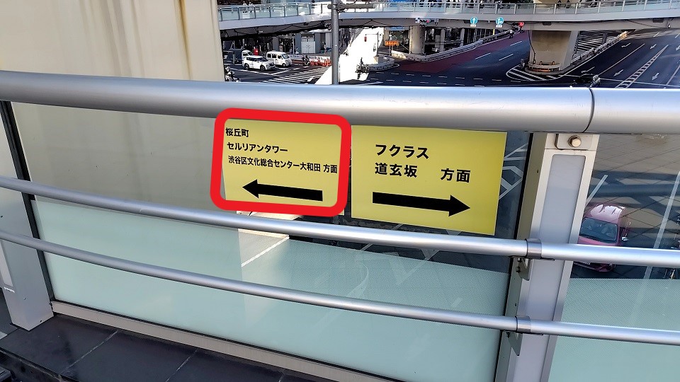 突き当りを「渋谷フクラス」「桜丘方面」の案内に従い、歩道橋に出ましょう。