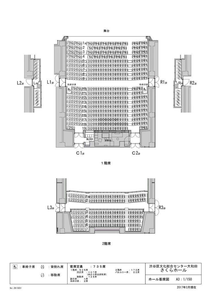 さくらホールの総客席数は735席で、1階席と2階席の二層バルコニー形式の構造です。