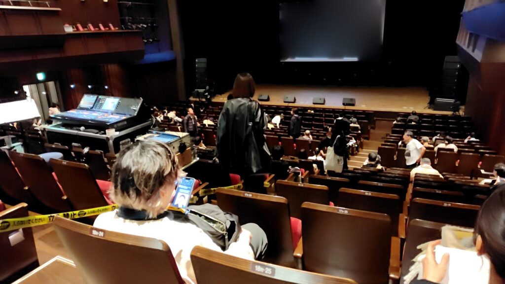 ステージに正対するスタンド席は1列から7列まであり、途中出入口扉のある2列目と3列目の間に中央通路が設置されています。