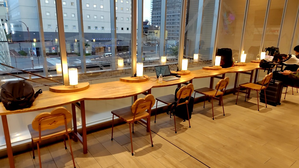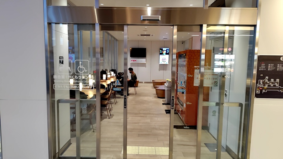 駅の2階には「やくもラウンジ」というフリースペースがあります。営業時間は4:35~23:00と、ほぼ1日利用できます。