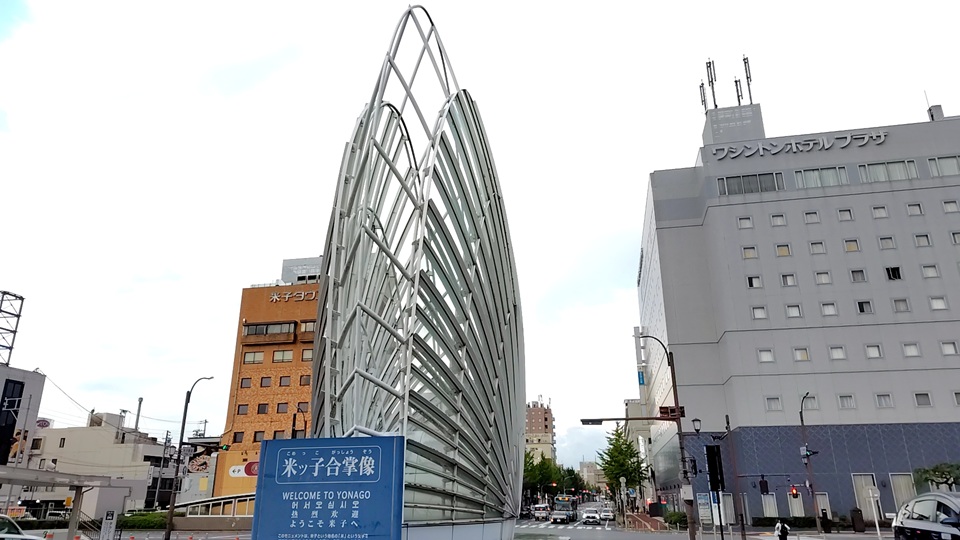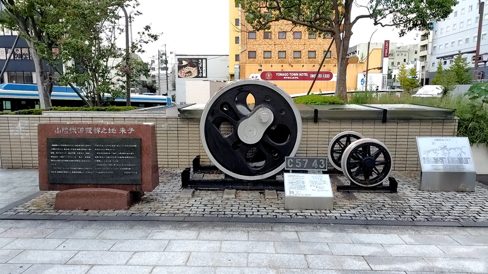 会場に近い駅の北口には巨大モニュメント「米ッ子合掌像」や「山陰鉄道発祥の地米子碑」もあります。