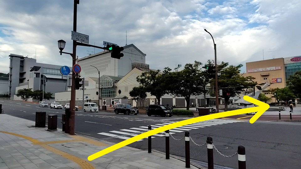 そのまま北に進み、「ビッグシップ前」交差点の横断歩道を渡ります。