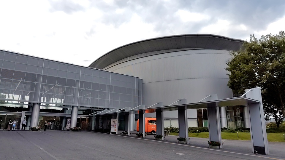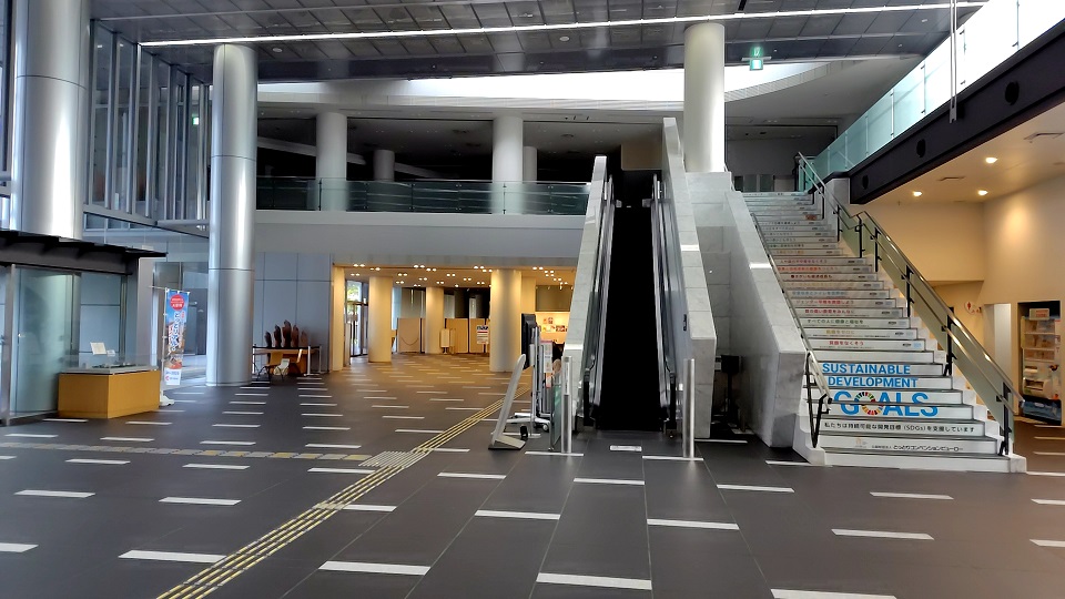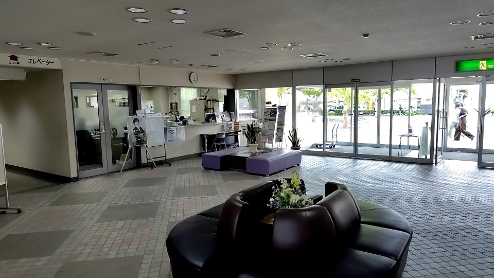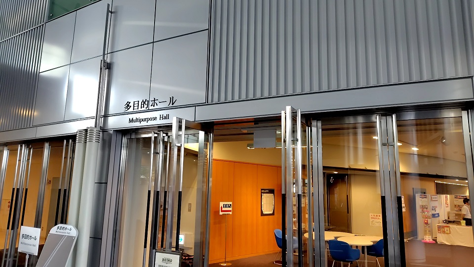 会場に着いたら、正面入口の先にエントランスロビーがあり、多目的ホールのエントランスや会議棟(情報プラザ)の入口に続いています。