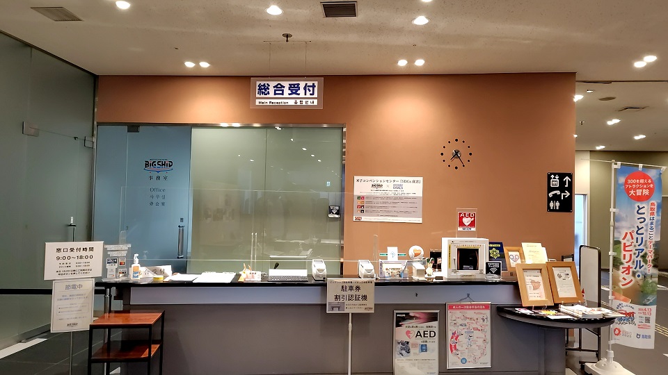 入口奥には総合受付があり、駐車場割引で利用する機器も設置されています。