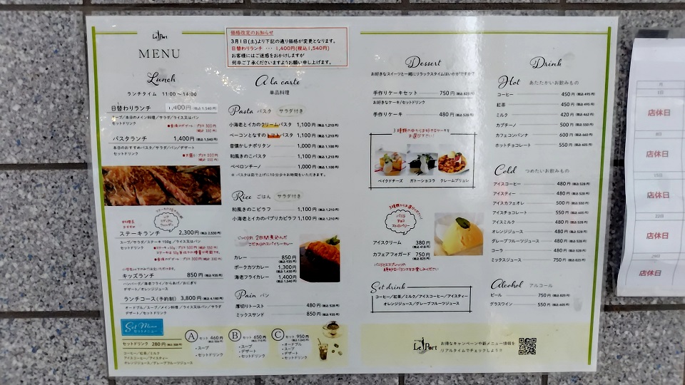 メニュー表。日替わりやパスタのランチのほか、コース料理やスイーツ・ケーキセット等も取り扱っています。