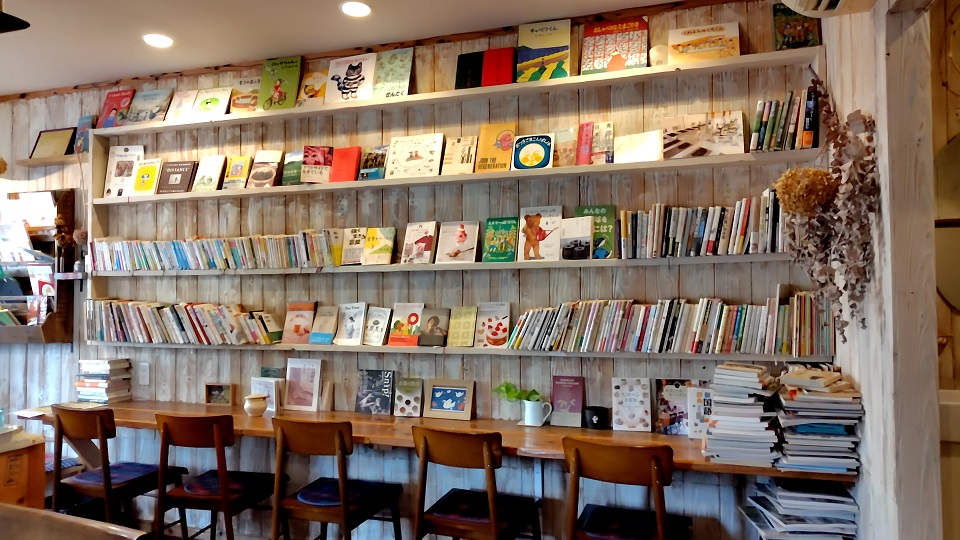 落ち着いた青い外観から中に入ると、アンティークな内装と様々なジャンルの本が棚に飾られているのが目に入ります。