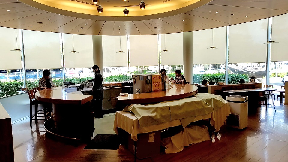 船の名前を冠した店内は外観と同じドーム状になっており、中央に給仕スペースが設置されています。