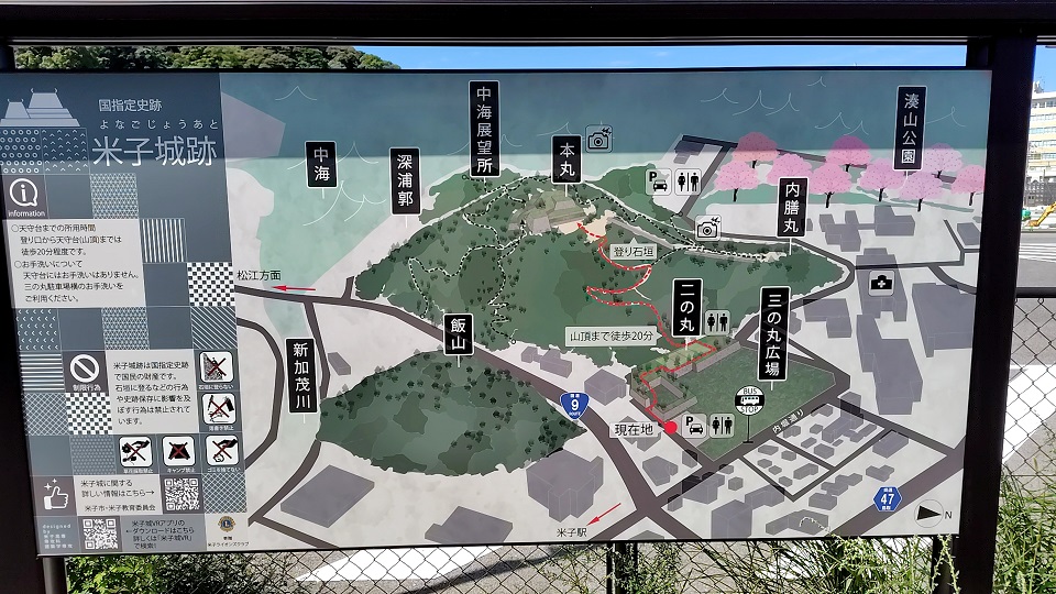 米子に来たら、ぜひ「米子城跡」に登っておきたいところです。会場から北西の中海方向、新加茂川沿いに約15分ほど歩いた所にあります。