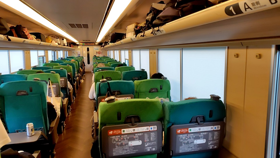 指定席の車両内です。全席コンセント・車内Wi-Fi完備で、セミコンパートメント車両も配備されています。