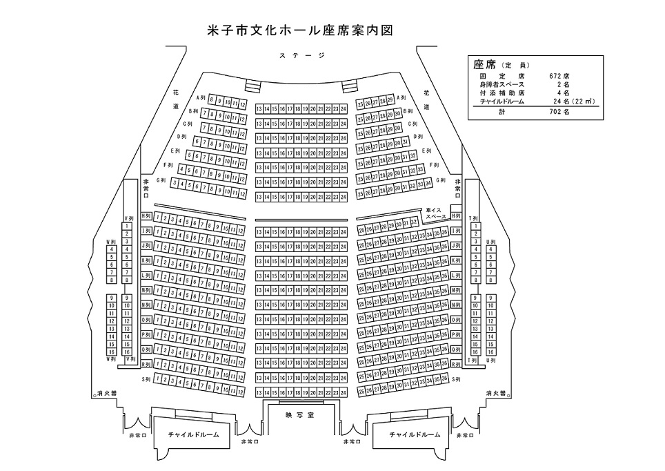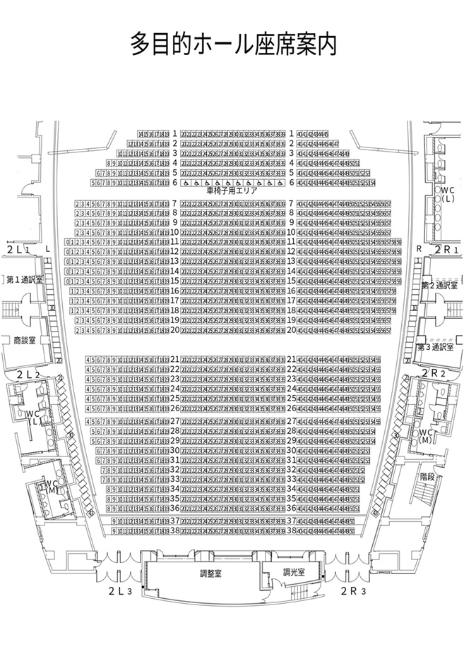座席は1列から36列まであり、途中6列と7列、20列と21列の間に通路が設置されており、6列中央ブロックは座席が省略され、車いす席用のスペースが10席分確保されています。