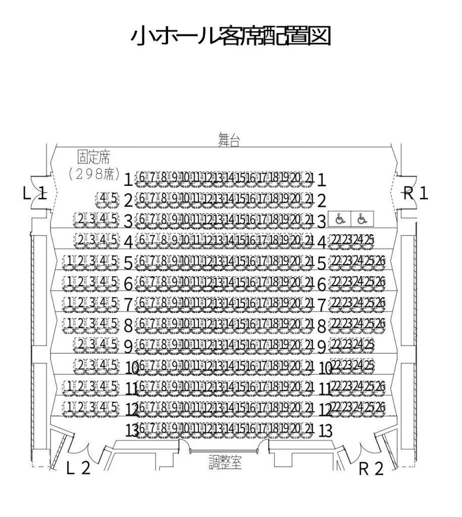 小ホールの総客席数は300席(固定席298席、車いす席2席)で、ホール棟の2階にあります。講演会や発表会のほか、ピアノ・室内管弦楽の演奏会や小演劇、ファッションショーなど多目的に利用可能です。