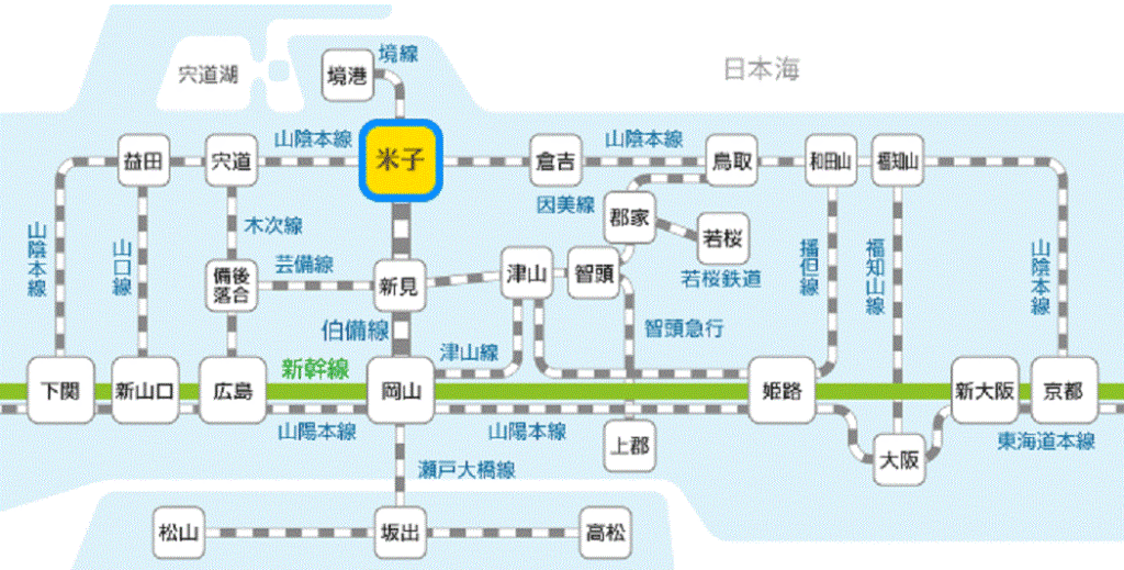 新幹線等で瀬戸内海側の岡山駅まで来たら、そこから北上し、日本海側の米子駅まで伯備線の特急「やくも」に乗り換え、米子駅を目指す方法が一般的です。