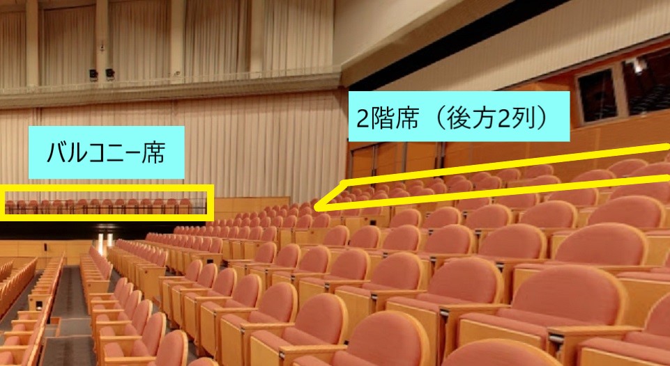 2階席の総客席数は170席で、ステージを三方から取り囲むように、正面にある固定席84席と、左右のバルコニー席86席に分かれています。